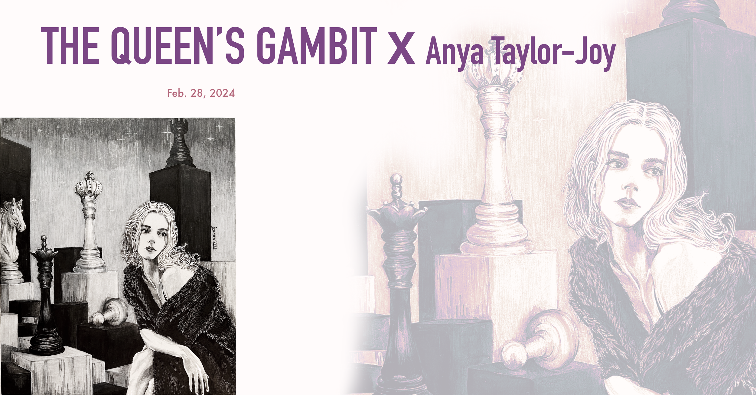 This was my second exploration of the theme from The Queen’s Gambit. The stark contrast of the black-and-white chessboard remains an excellent subject for ink sketching practice. However, this time, I transformed the flat board into a rhythmic 3D structure by varying the heights of the squares, creating a visually compelling composition. I maximized the contrast by positioning white pieces against a black background and vice versa, with the king and queen highlighted in dramatic duel positions. The image of Anya Taylor-Joy adorned in an opulent coat allowed me to experiment with rendering fur textures for the first time. The illustration’s primary flaw was the unnecessarily exaggerated background perspective, which proved challenging to depict with precision.